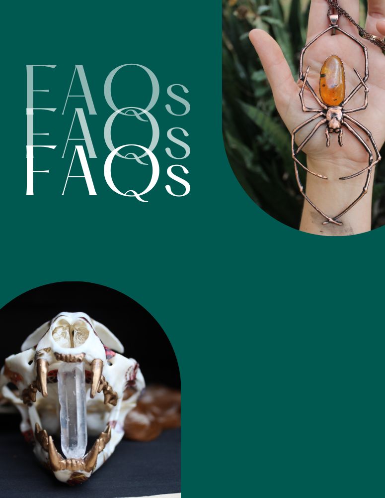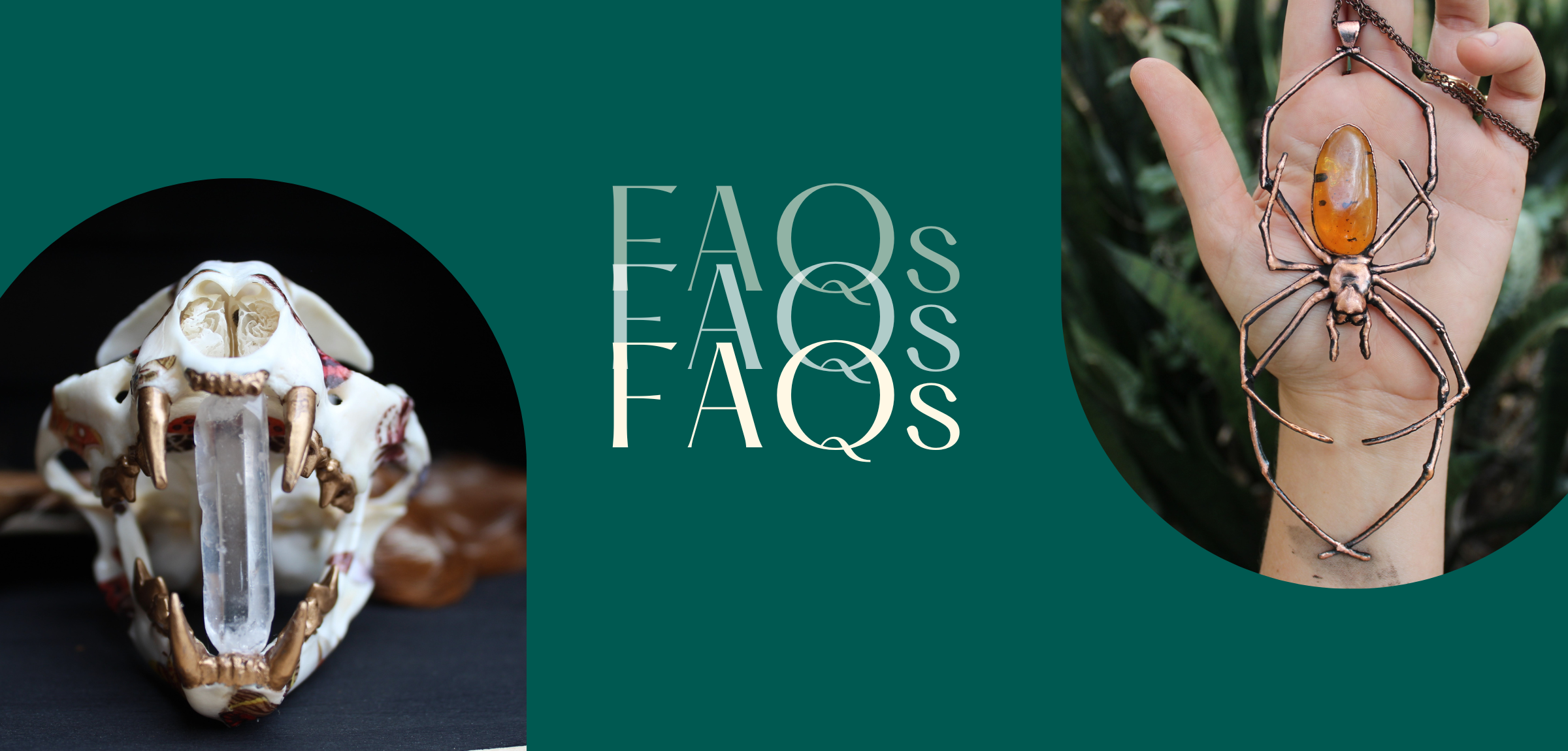 A: No! Some pieces, like bones and skulls, are hand collected from roadkill or forest finds. Sometimes they come from farms. Insects are always collected after their natural death, either by me or by kind people all across the country who find them and send them to me. Some creatures, specifically scorpions and spiders, come from breeders that hang onto them after their natural deaths and send them to me in shipments.