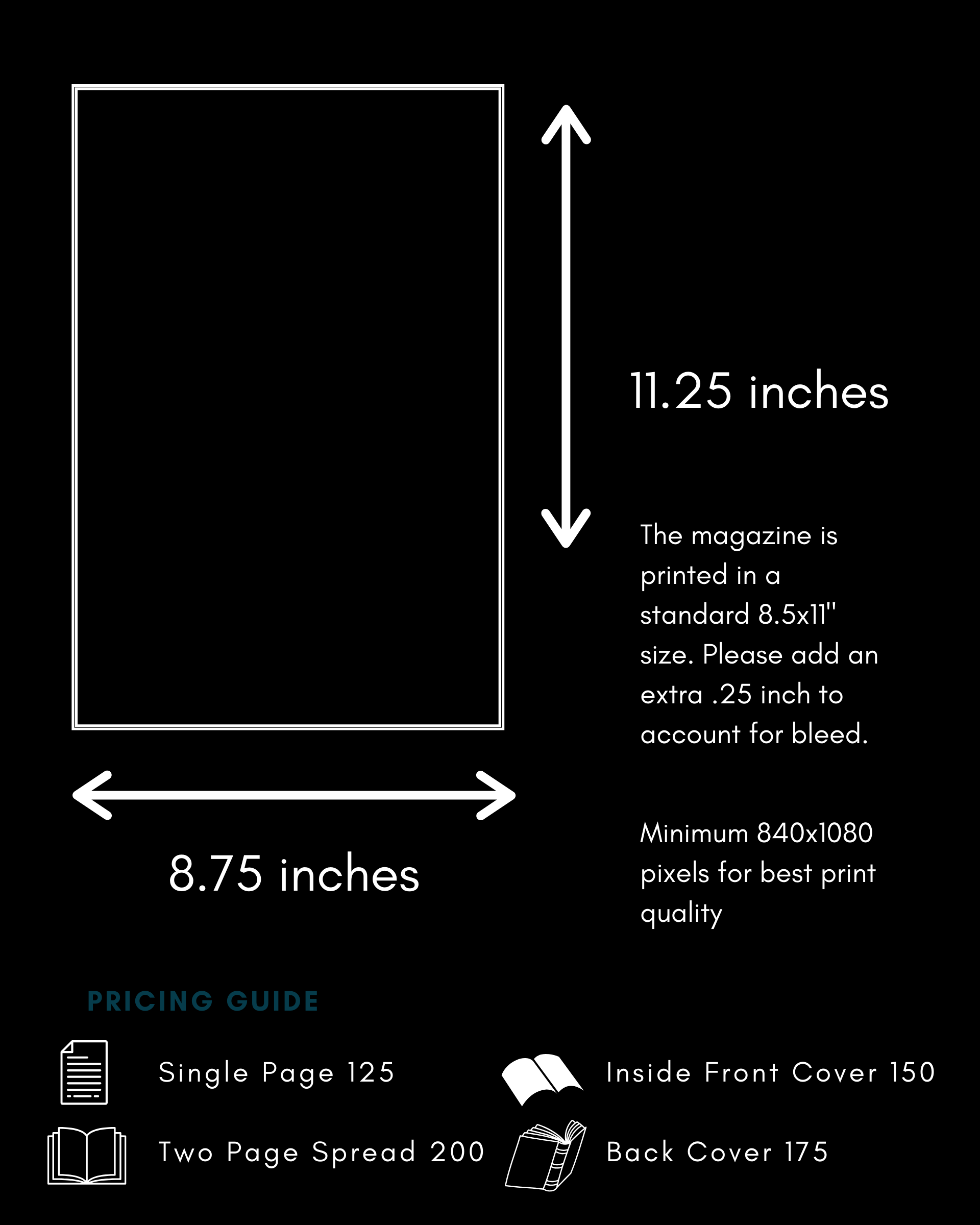 All of our ads are full page and printed in full color. We are an 8.5x11 inch magazine but do require an extra .25 inch bleed for printing. (8.75 x 11.25 total)