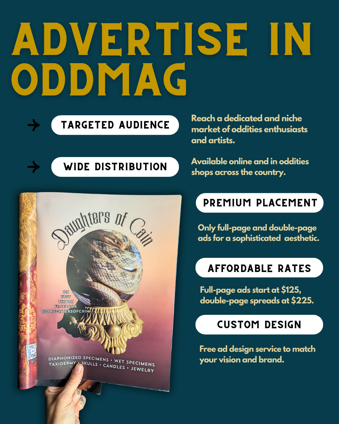 We would love for advertisements in our magazine to blend seamlessly with the overall aesthetic. If design is not your strength, don't worry! We are more than happy to help you come up with a cohesive design. Send an email to TheOddestMag@gmail.com to discuss design options.