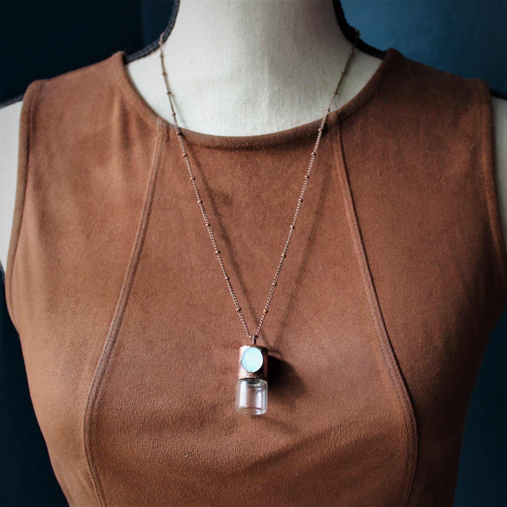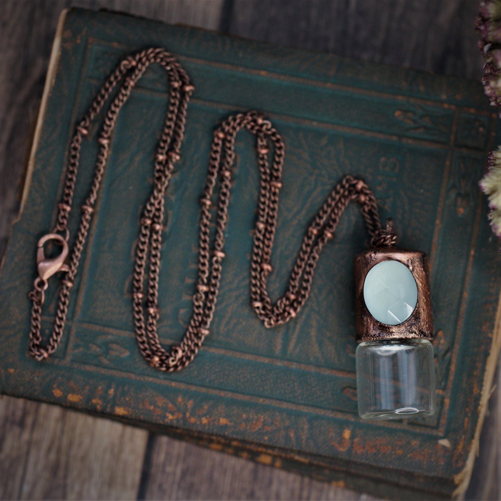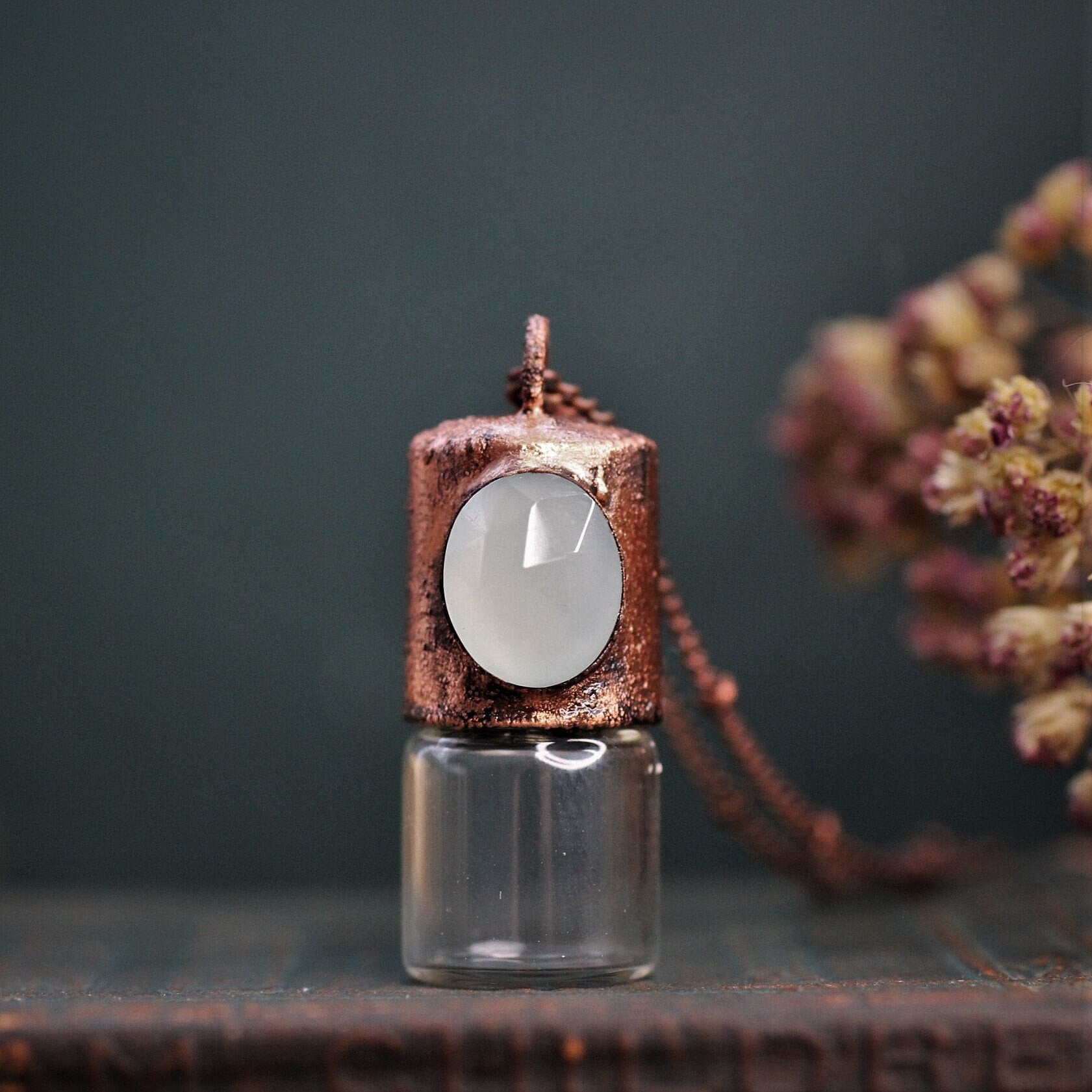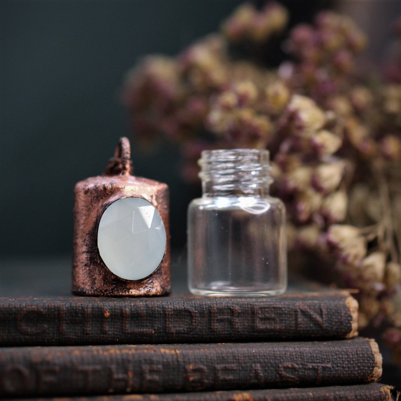 The top of this vial has been electroformed with a blue rose-cut chalcedony stone. Blue chalcedony is said to absorb negativity and promote emotional harmony.