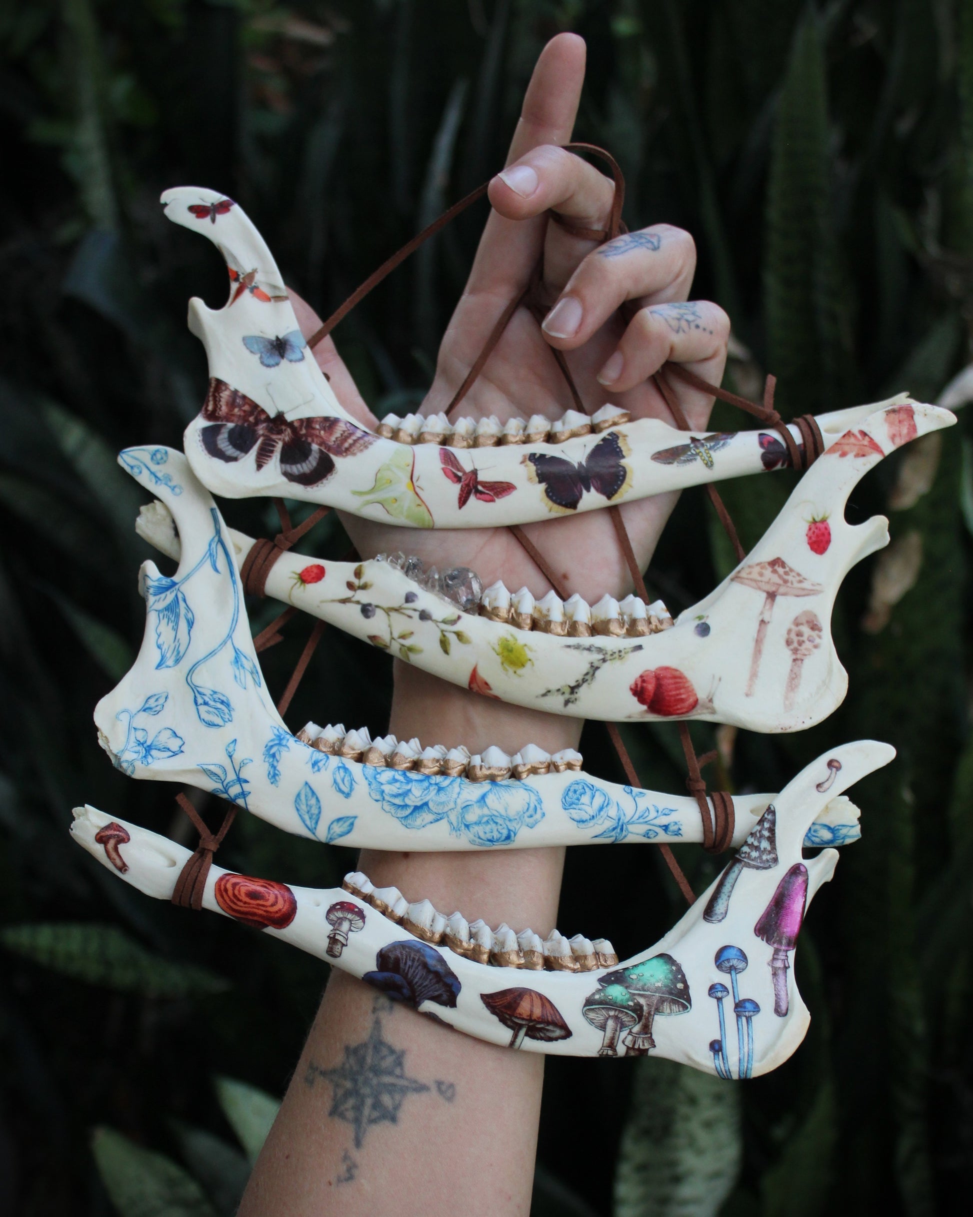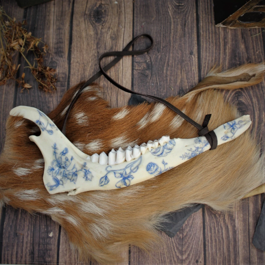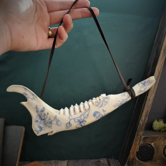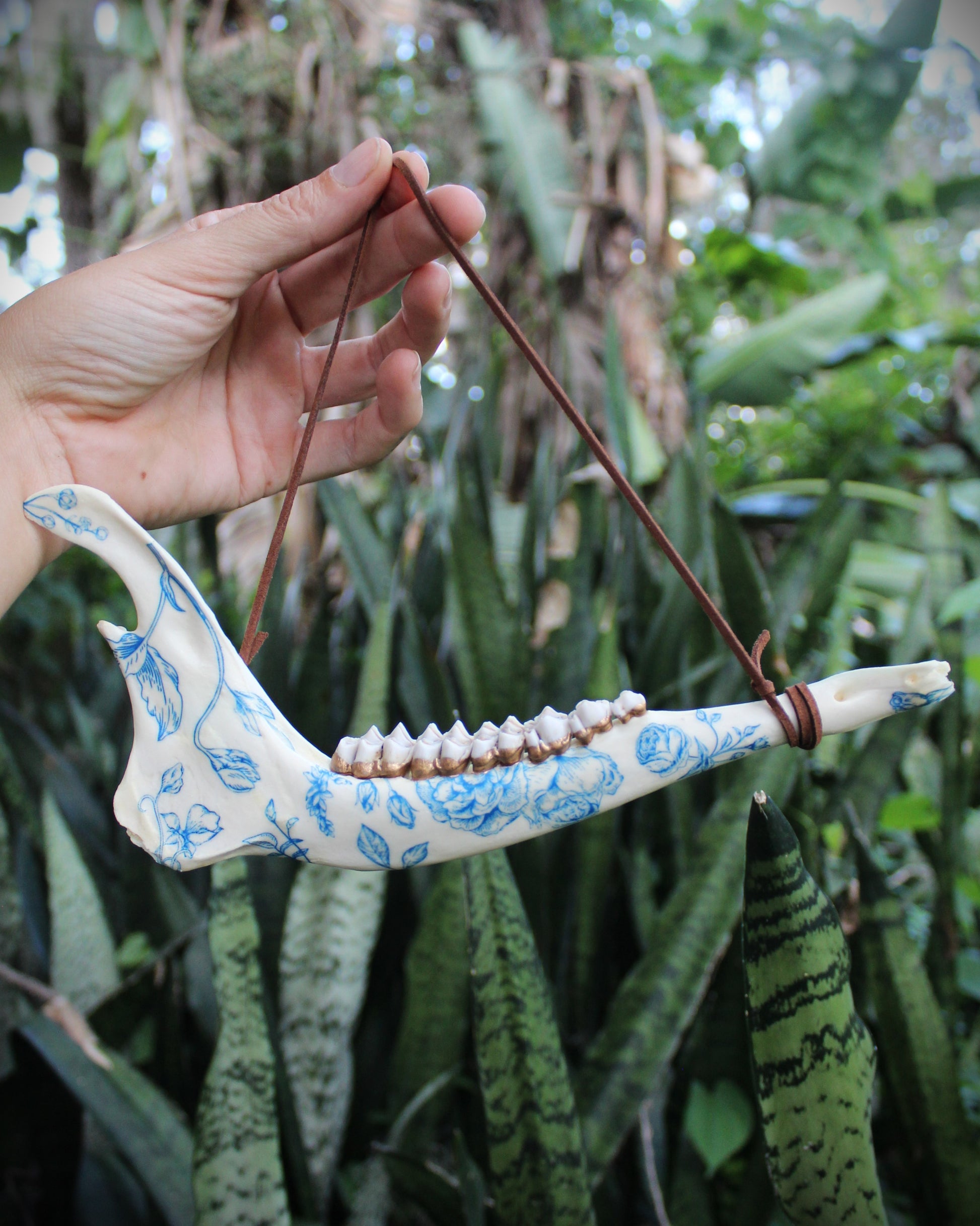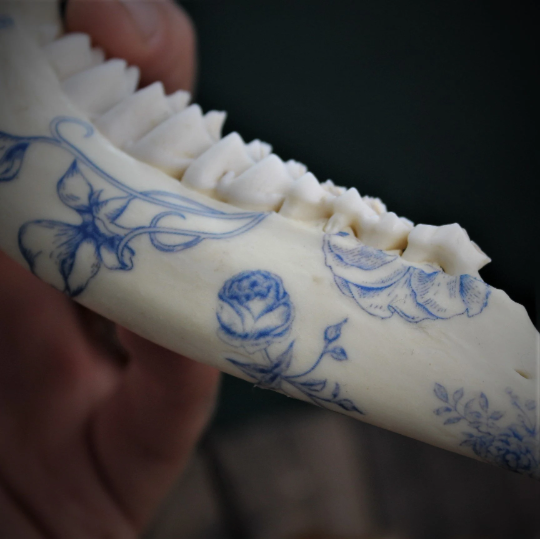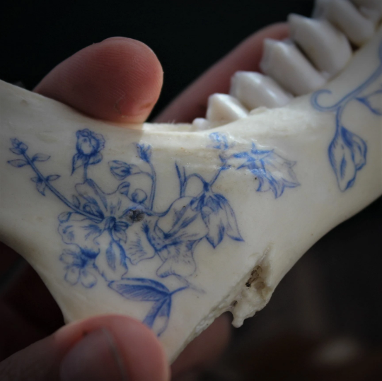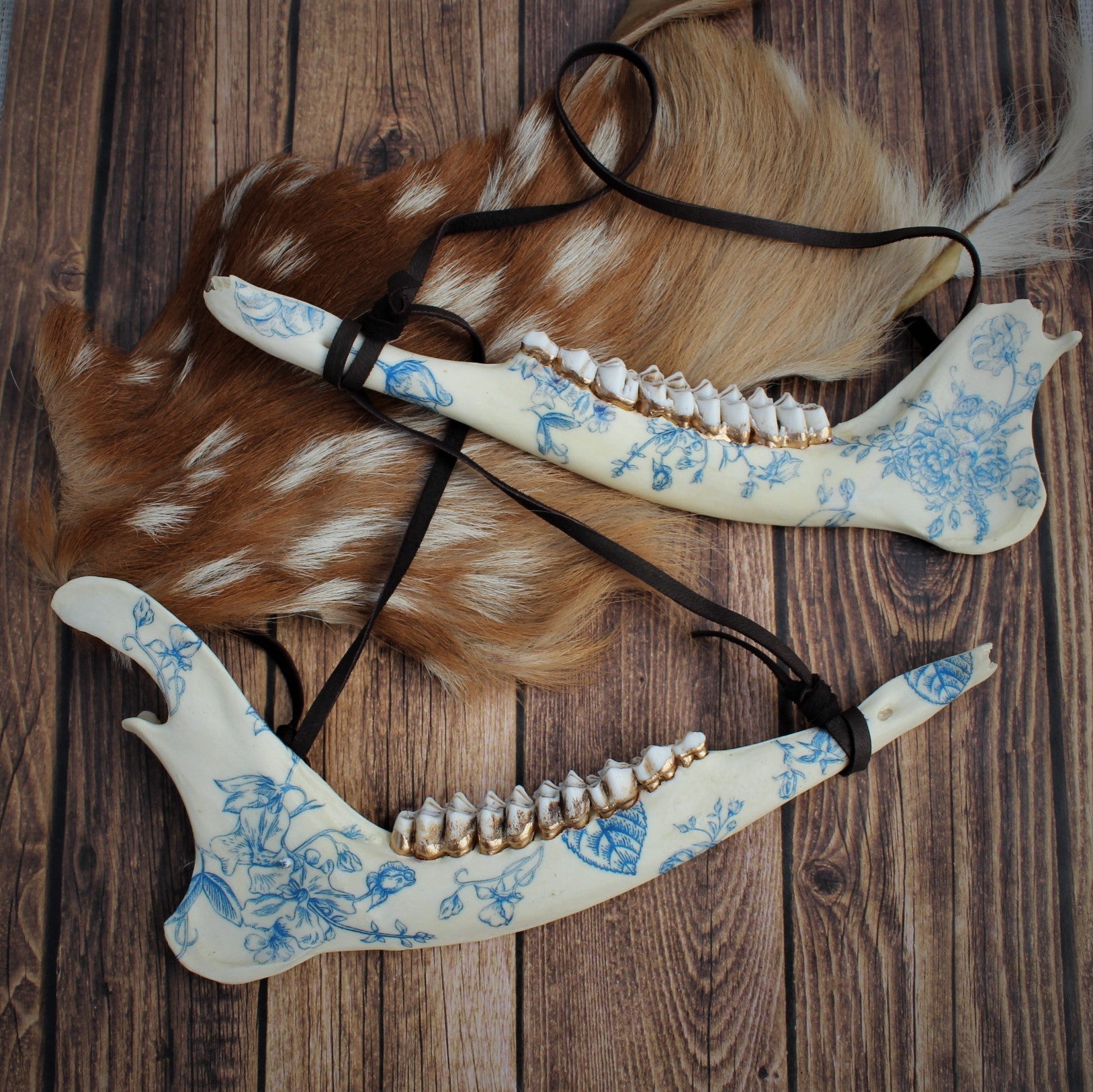 Each of these deer jawbones have been adorned with a blue floral design, reminiscent of delft porcelain.