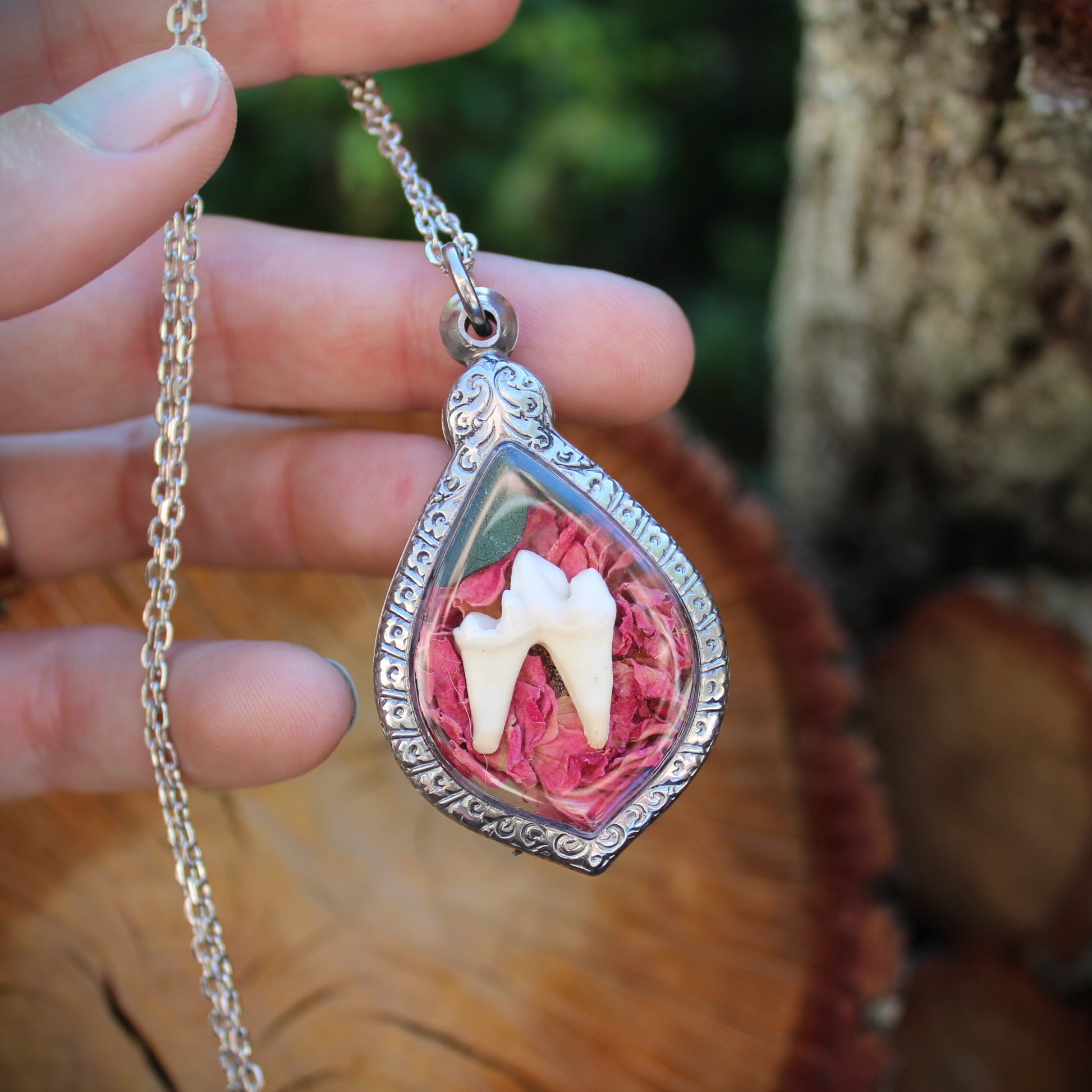 This reliquary holds one fox tooth, surrounded by rose petals and eucalyptus leaves.