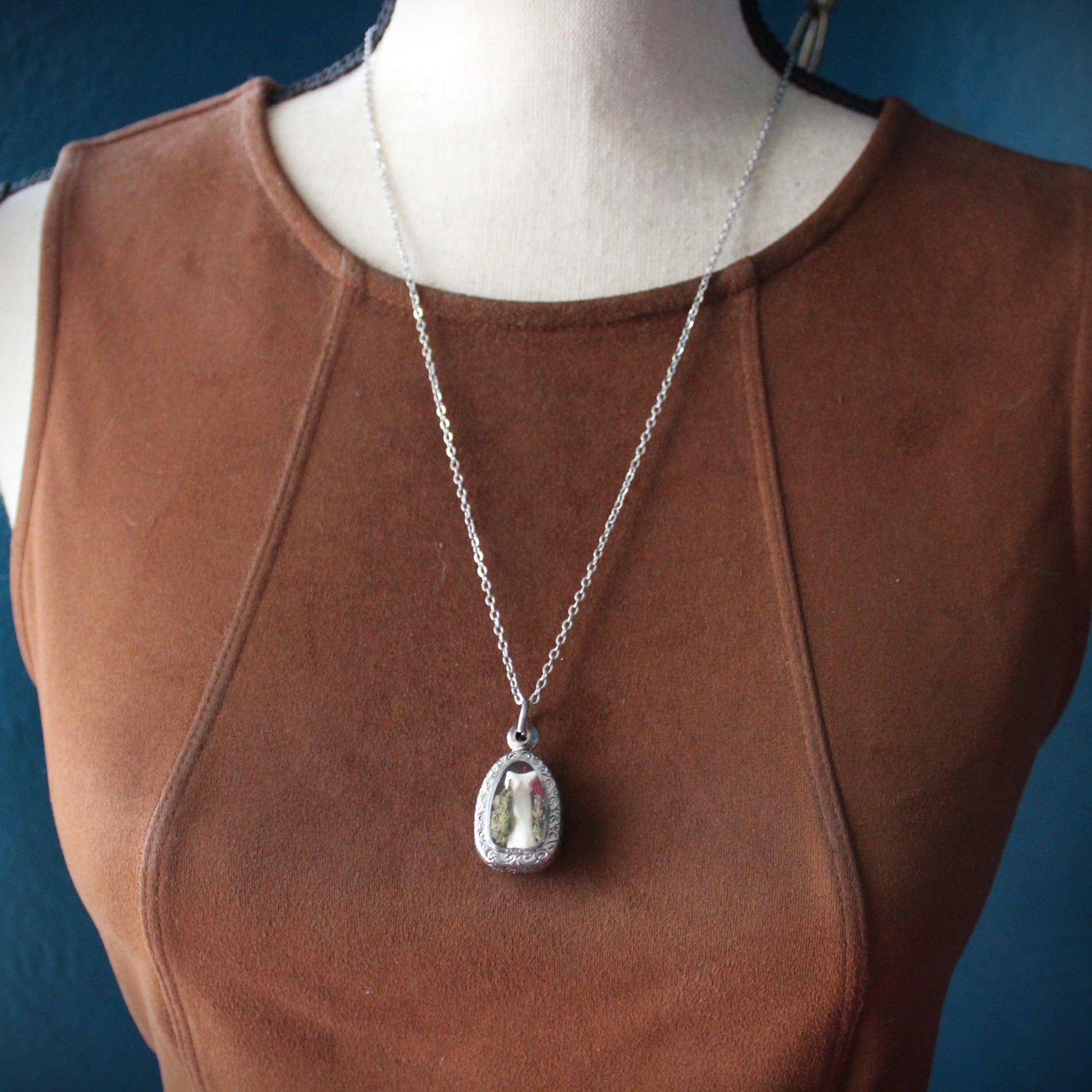 This piece measures about 1.75 inches in height and comes on a 24-inch stainless steel chain. If you would prefer a different length of chain or leather cord, please include a note at checkout.