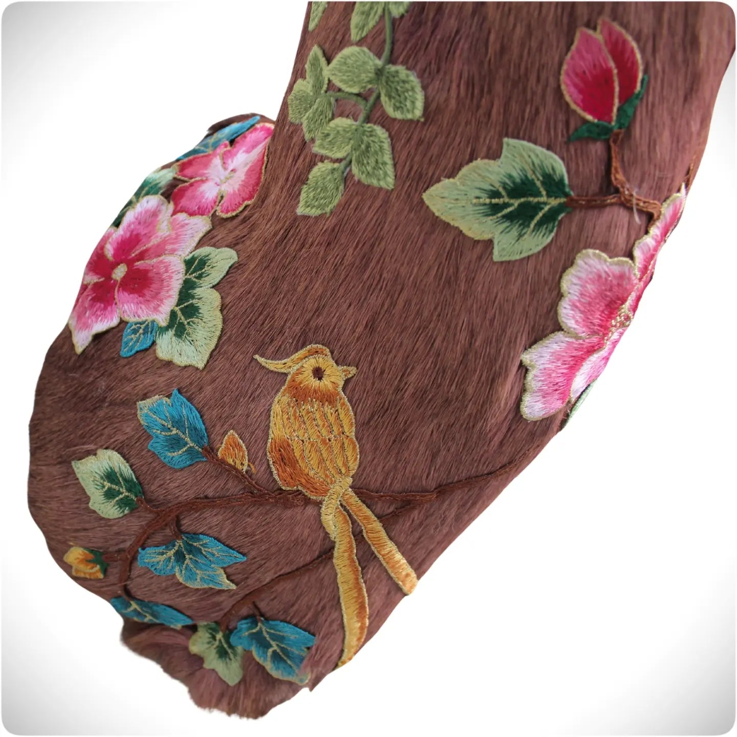 This deer was first dyed a subtle dusty rose color, then covered in embroidery patches.