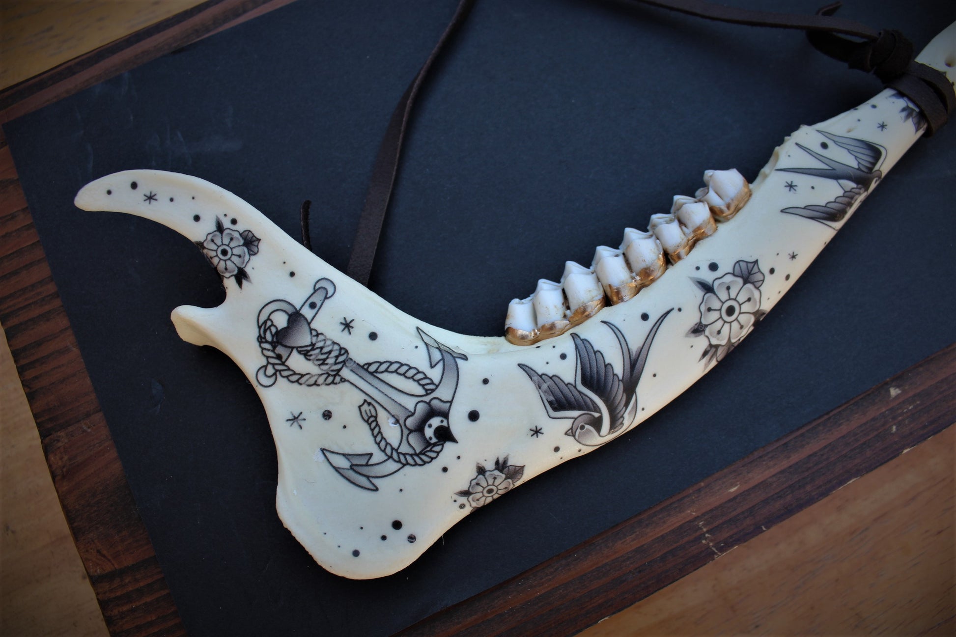 Each of these deer jawbones have been adorned with black and grey neo traditional tattoo designs, perfect for any oddities lover.