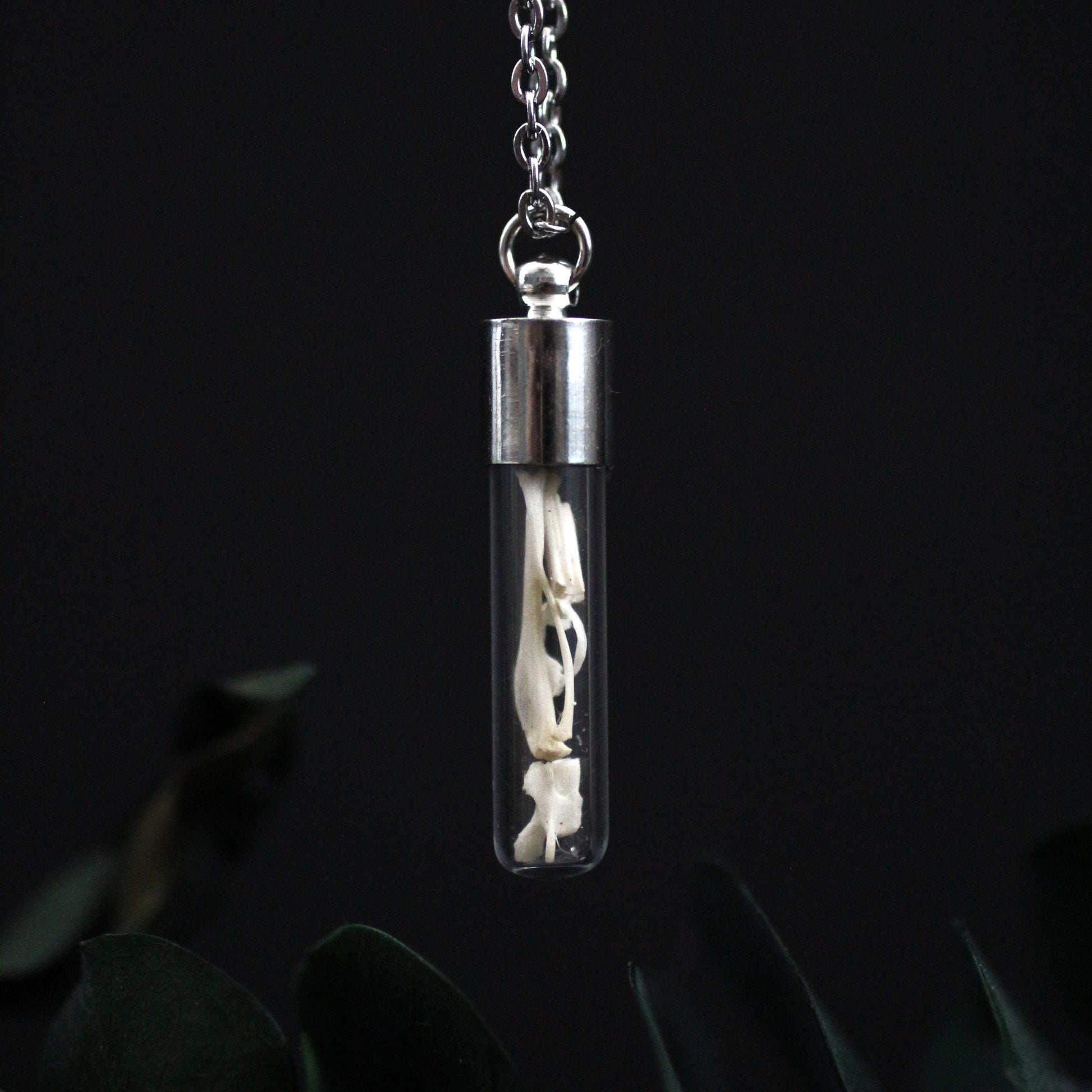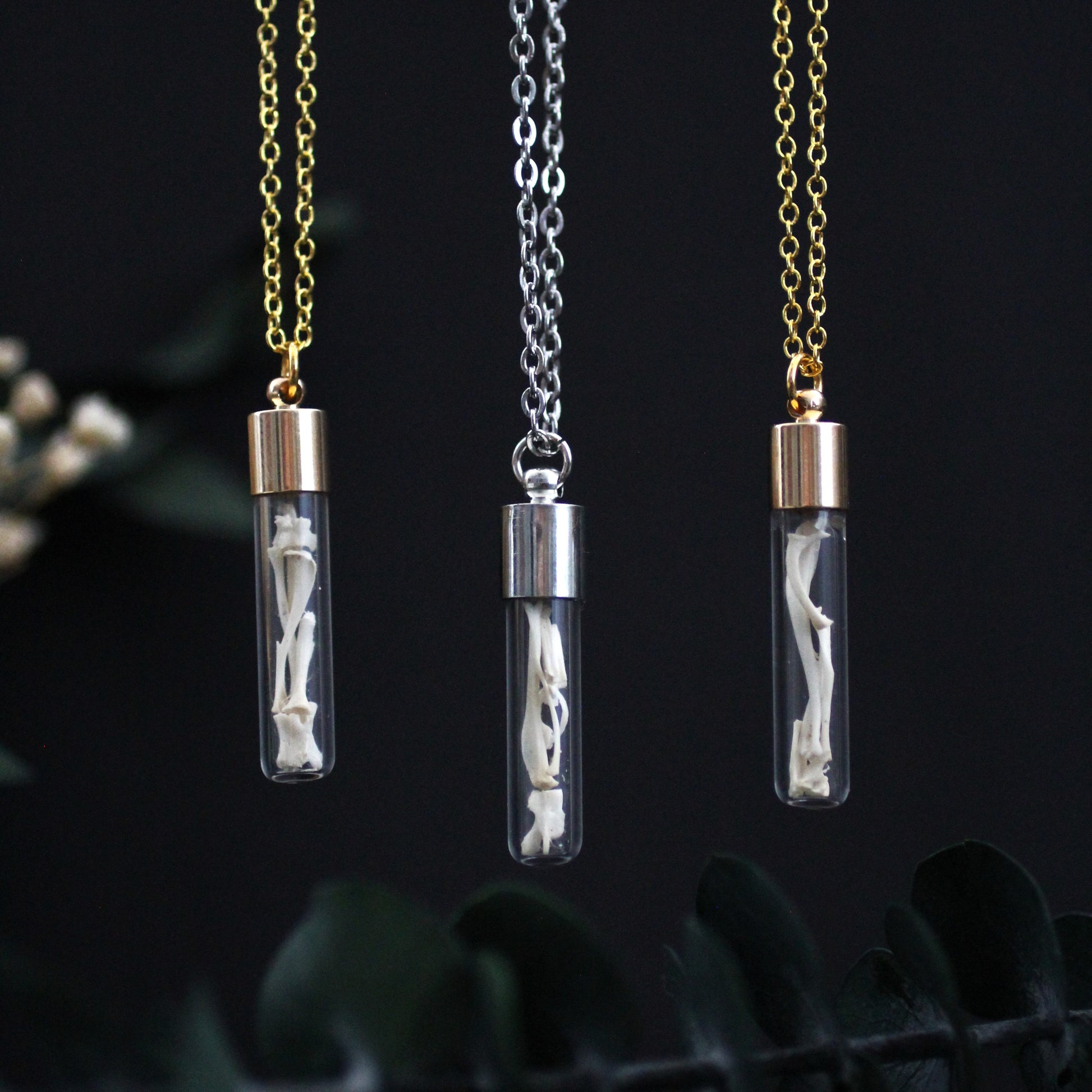 These tiny glass vial necklaces contain real bones, carefully sourced from owl pellets. Each vial holds a unique mix of bones—such as teeth, vertebrae, leg bones, and jawbones—from a variety of animals an owl might prey on, including mice, shrews, snakes, and even other birds. Every piece offers a one-of-a-kind glimpse into the natural cycle of life.