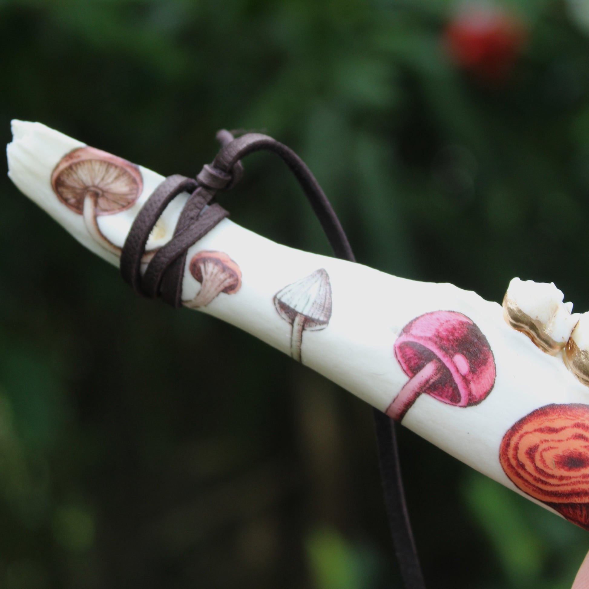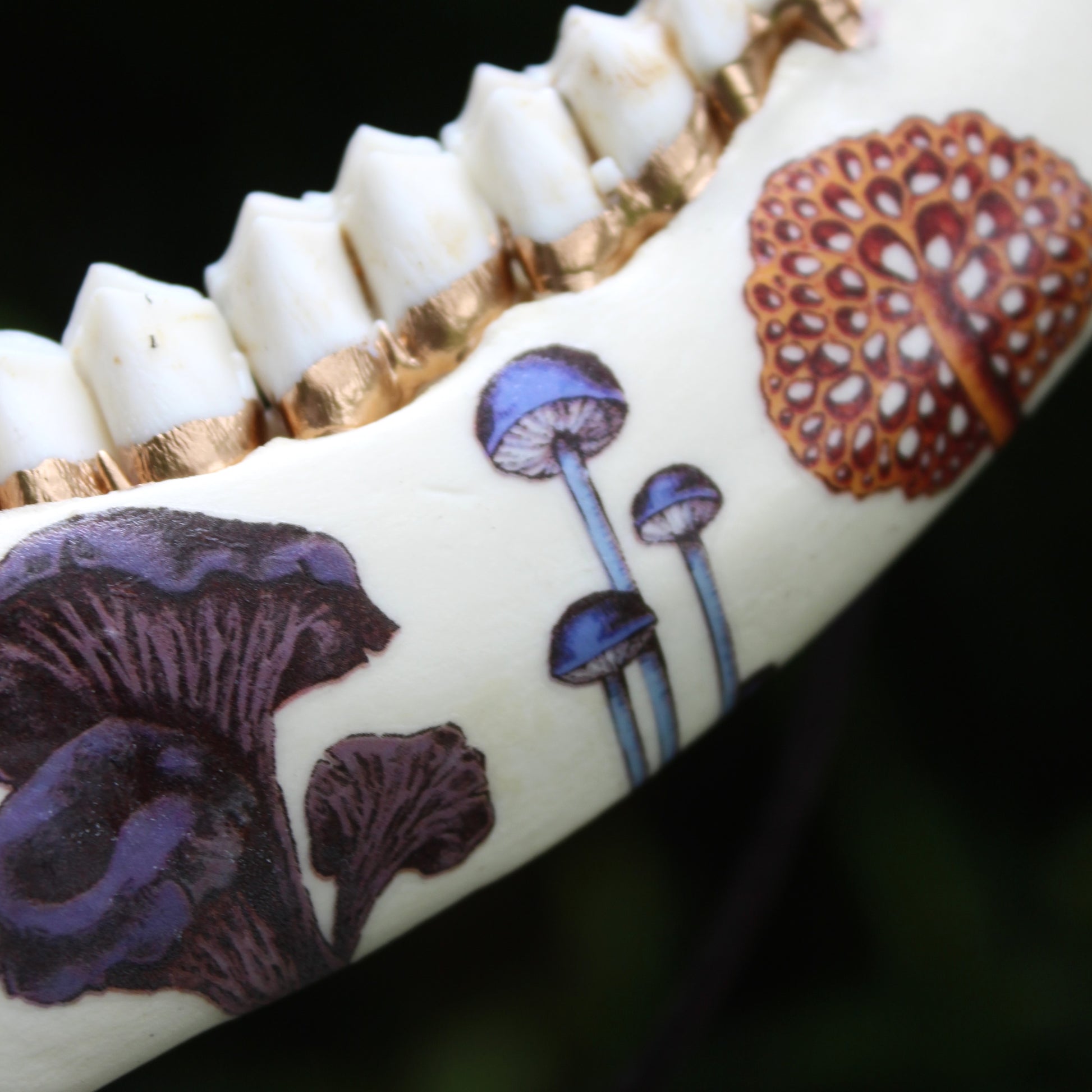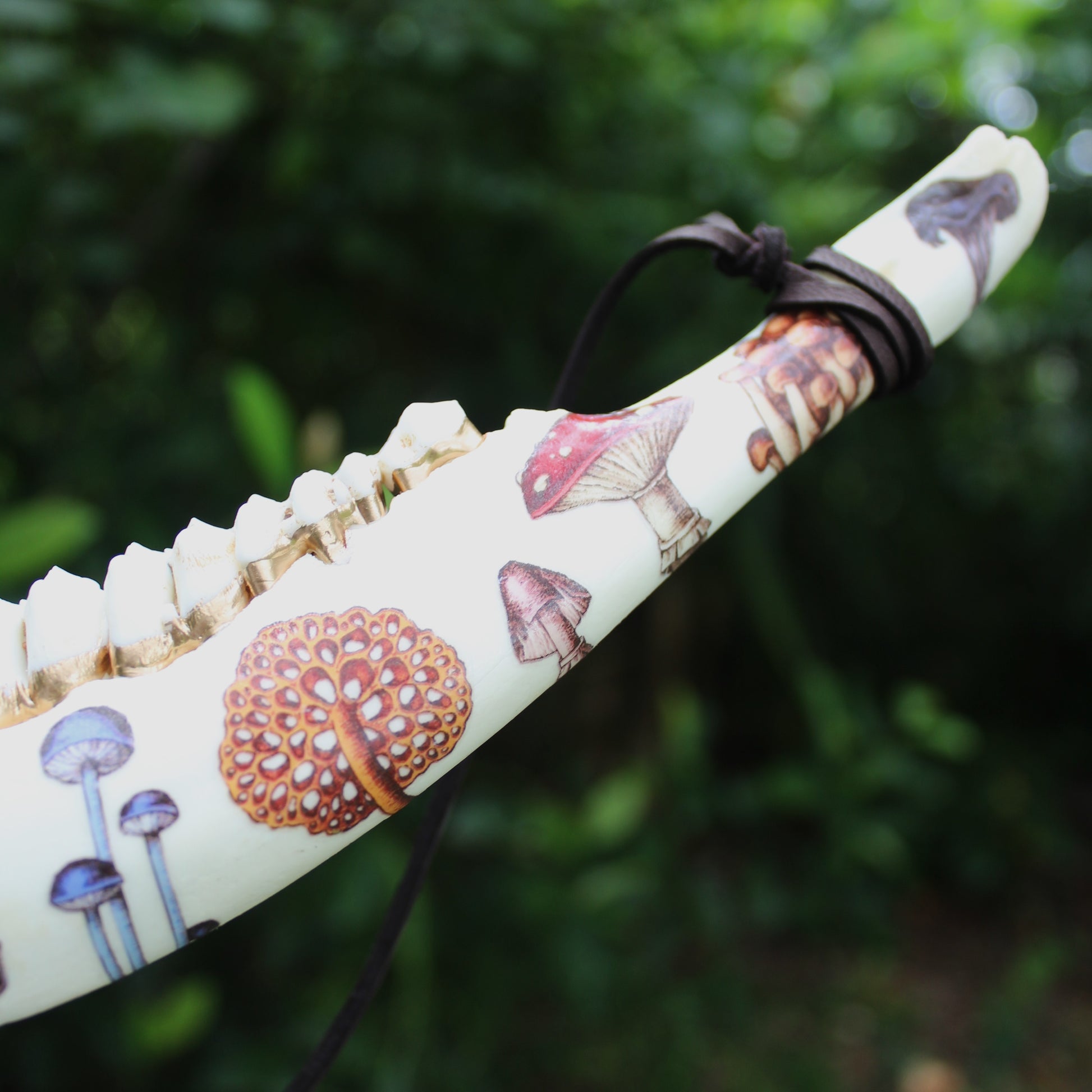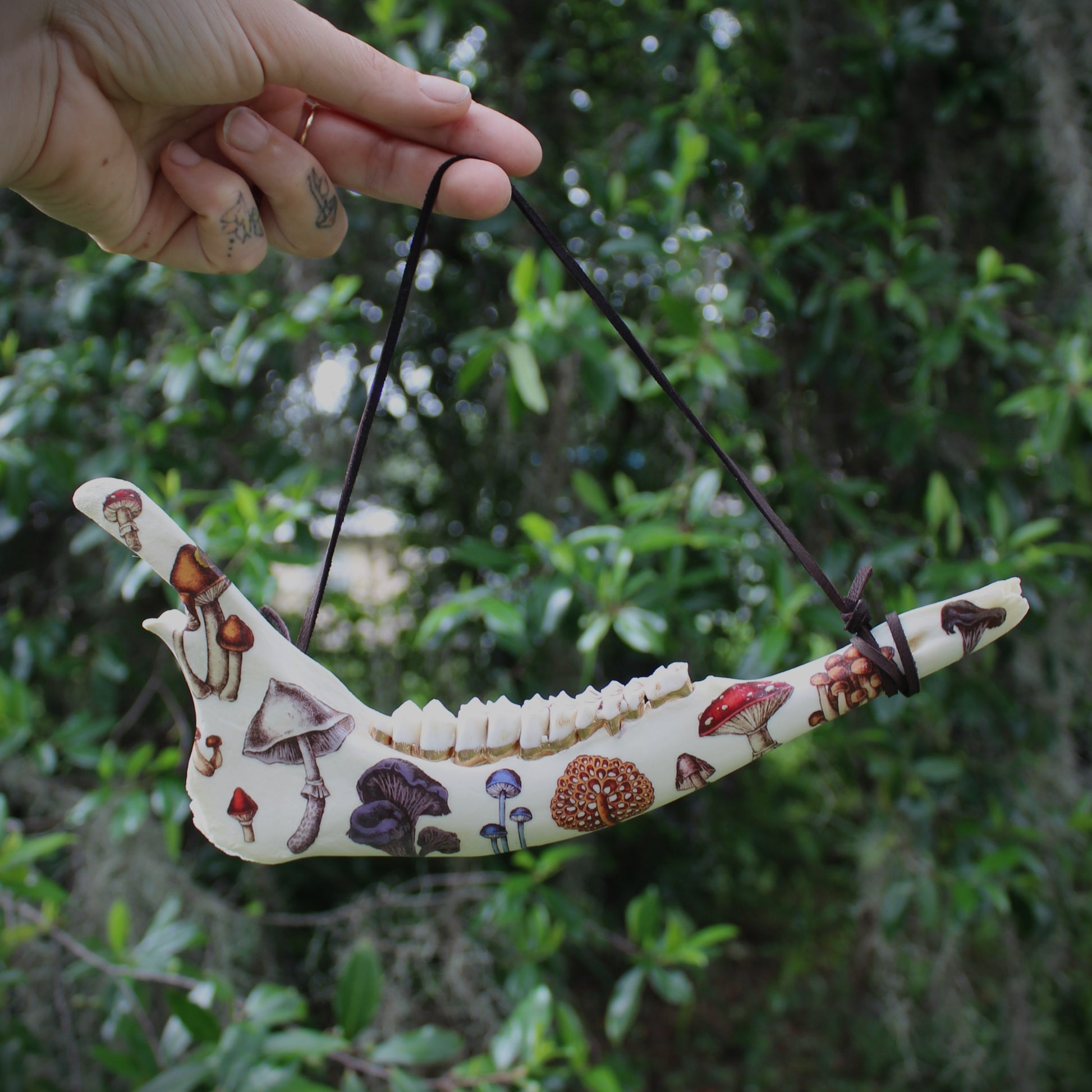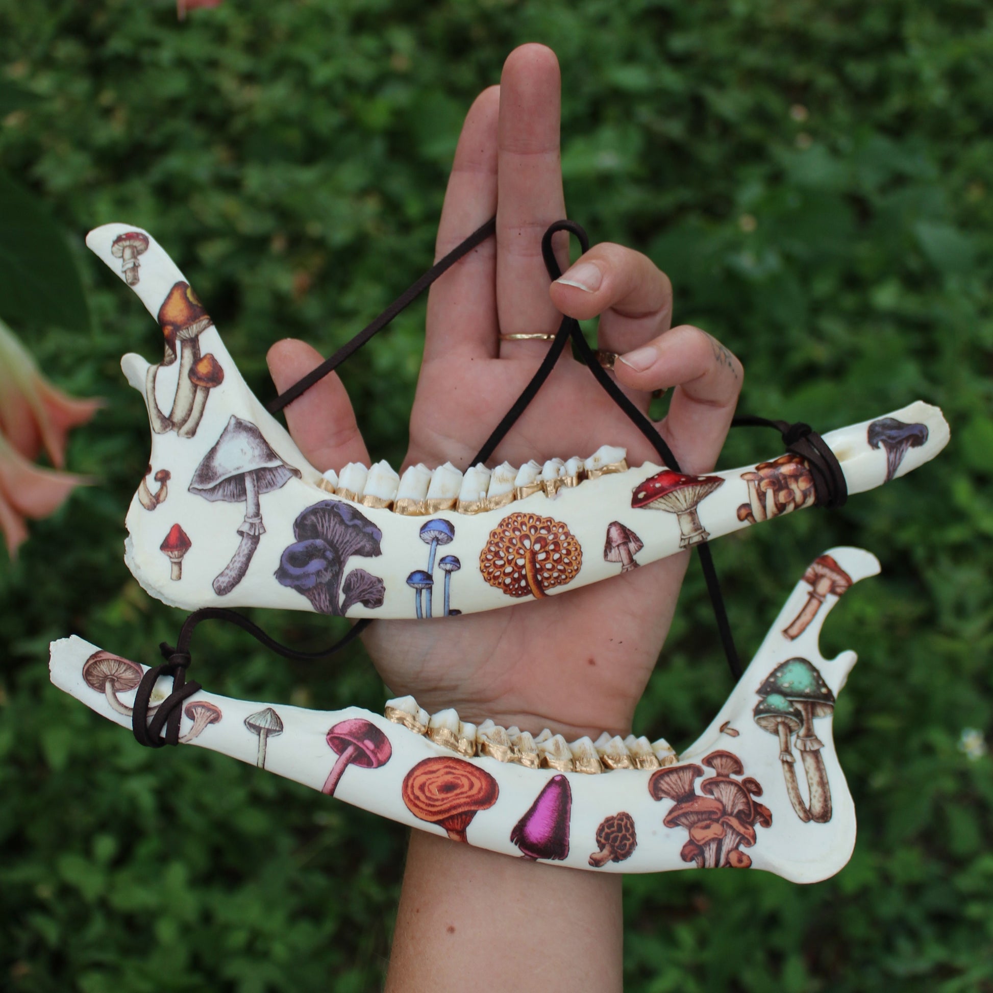 Each of these deer jawbones have been adorned with a variety of colorful magical mushroom illustrations. They are made to order, so no two pieces will be the exact same.