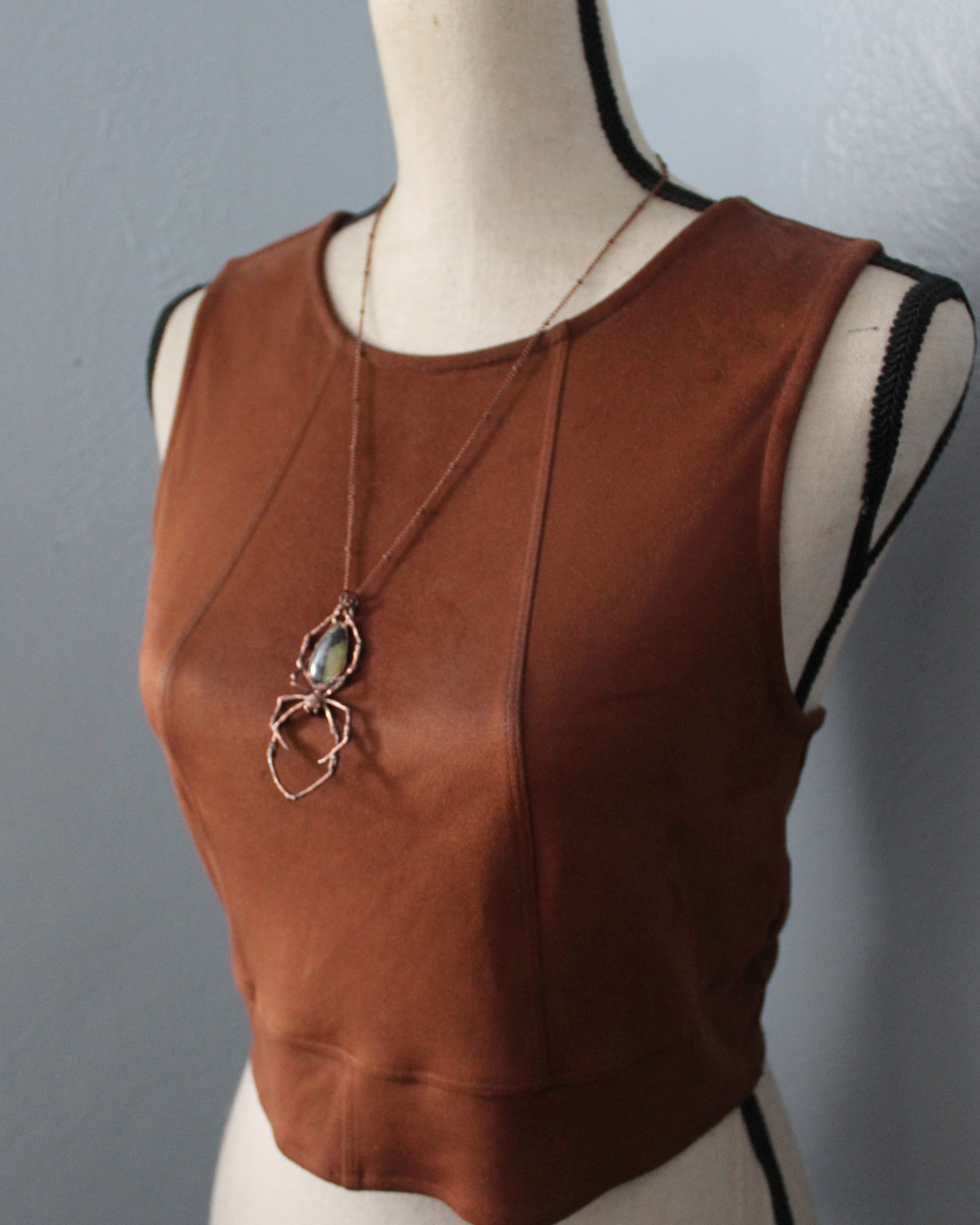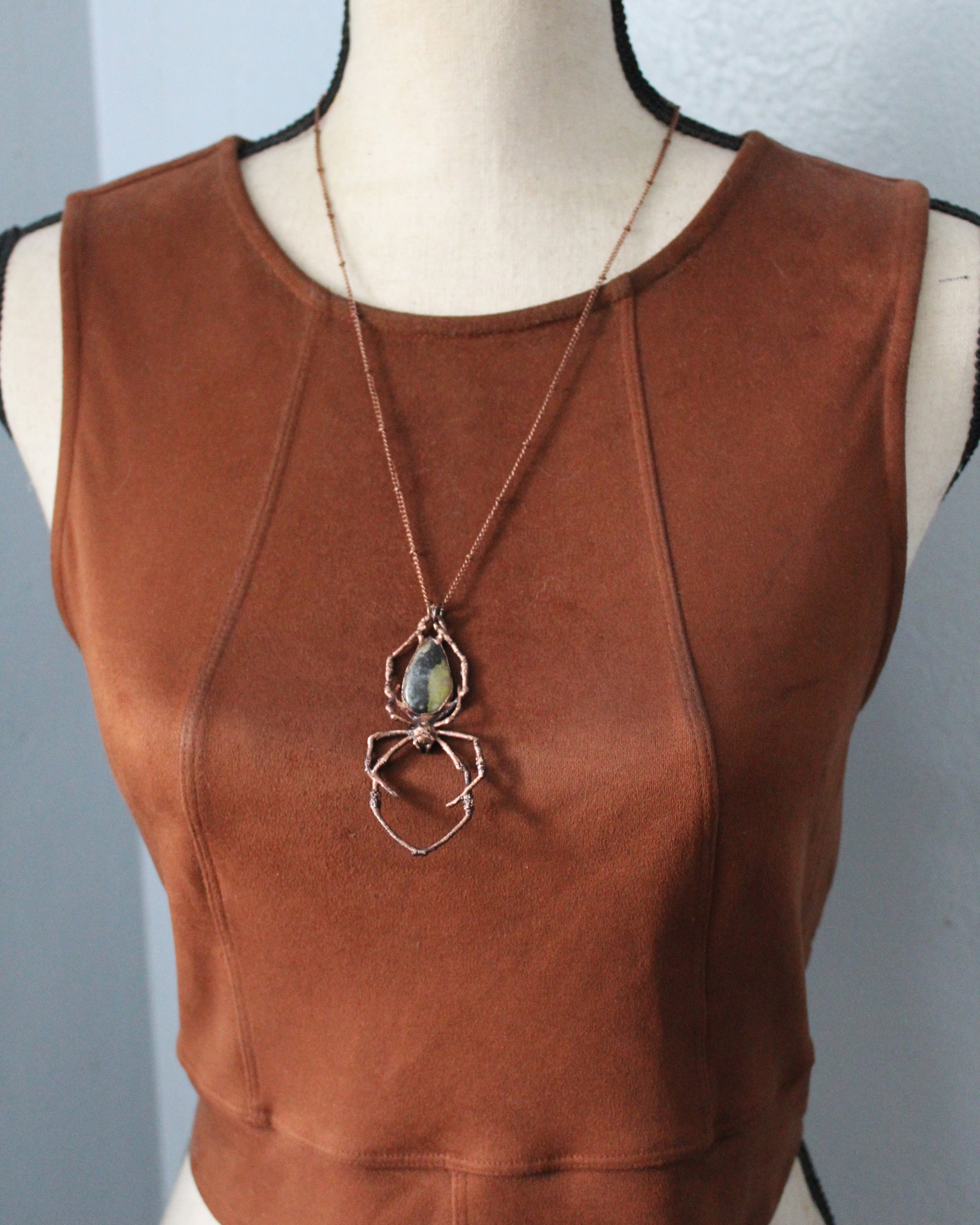 Each spider is carefully plated in copper so that you can see all of the fine details of her hairy legs and pedipalps (the tiny appendages that look like antennae or pincers). Her abdomen has been replaced with a black and yellow bumblebee jasper stone, chosen to represent her colors from life.