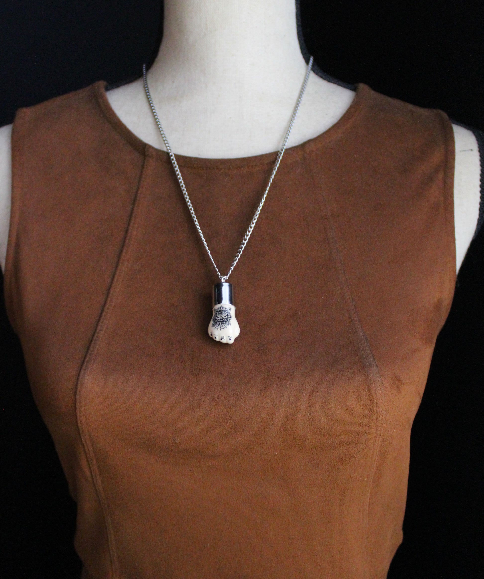 Each piece comes on a 22-inch stainless steel chain. If you would prefer a different length of chain or leather cord, please include a note at checkout.