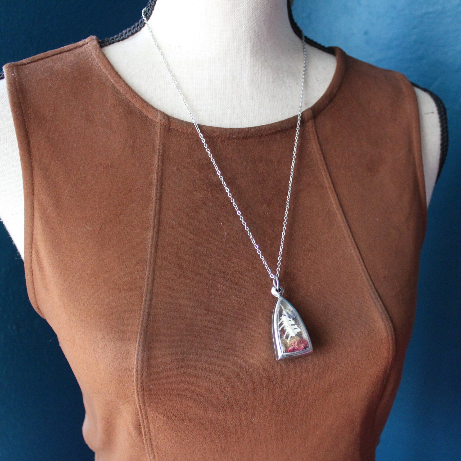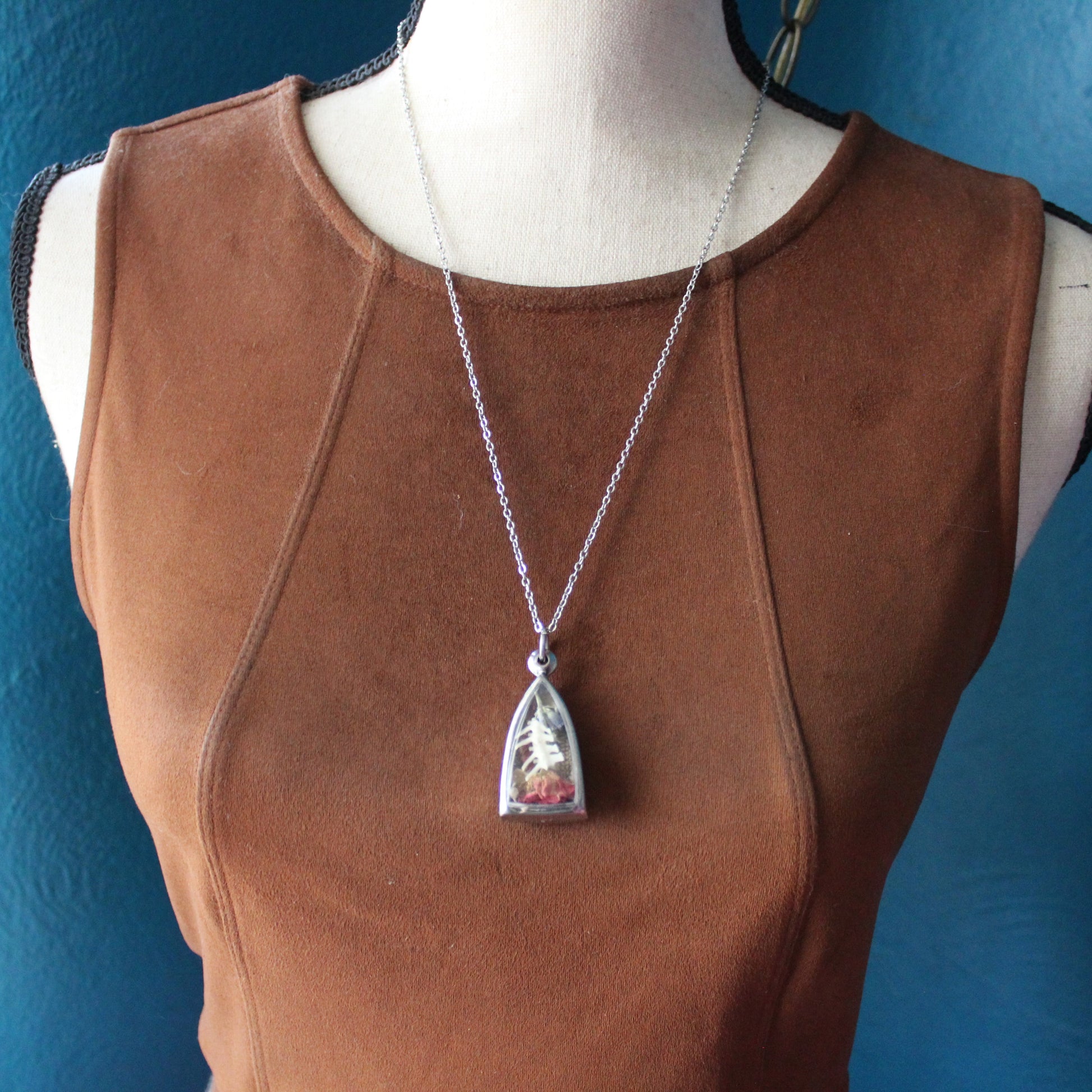 This piece measures about 1.75 inches in length and comes on a 24-inch stainless steel chain. If you would prefer a different length of chain or leather cord, please include a note at checkout.