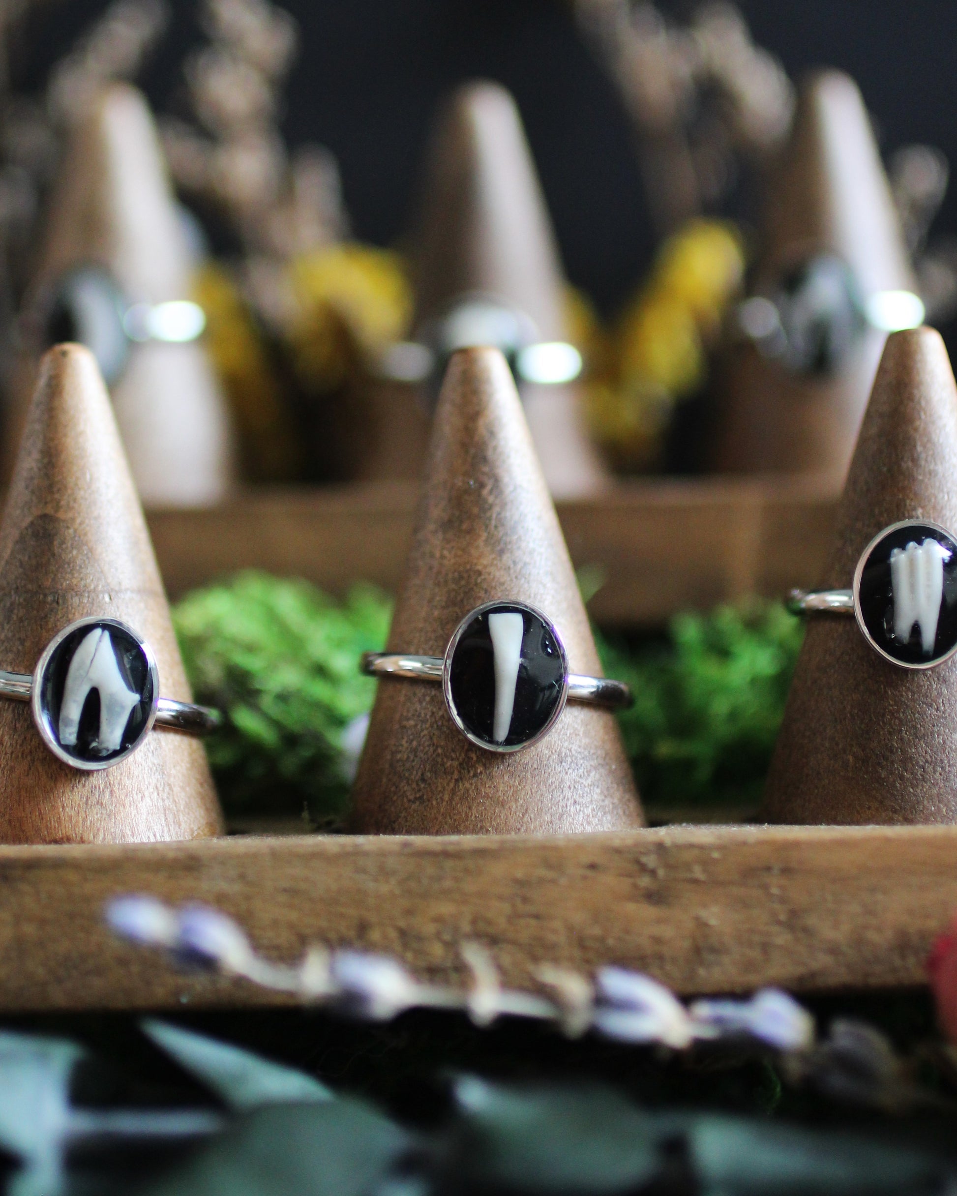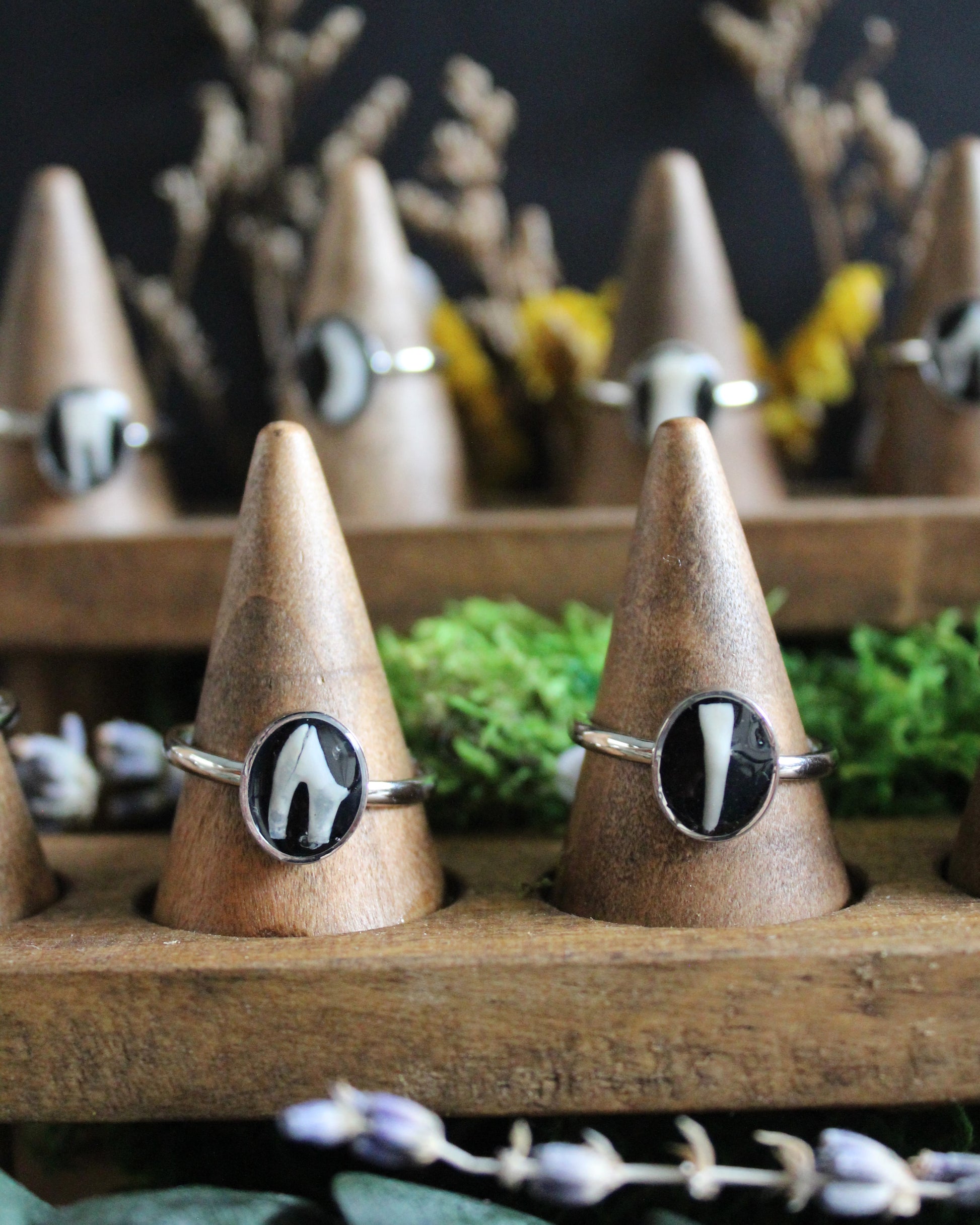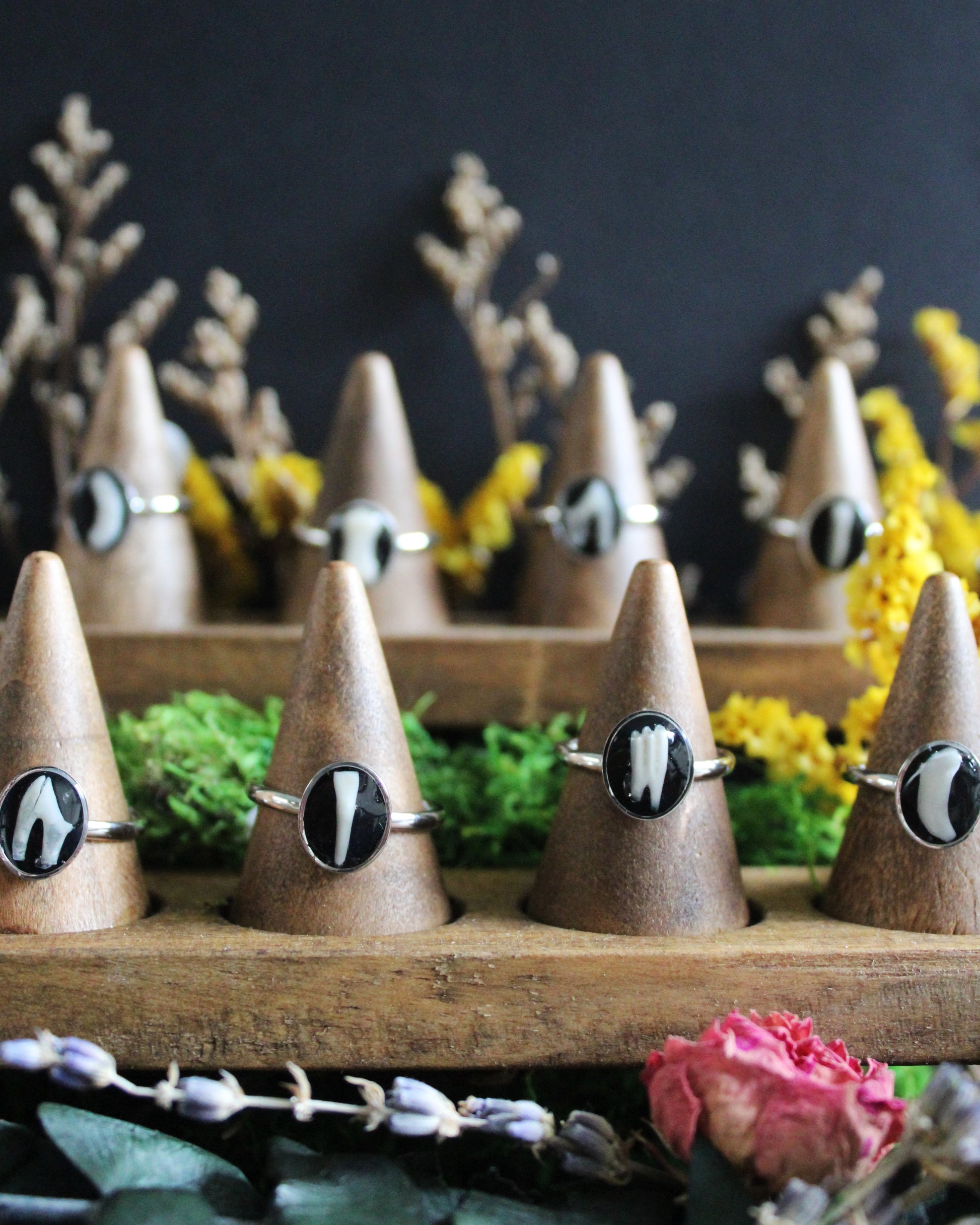 Real animal teeth set in high-quality doming resin. Teeth come from various animals, including but not limited to raccoon, fox, opossum, and muskrat.